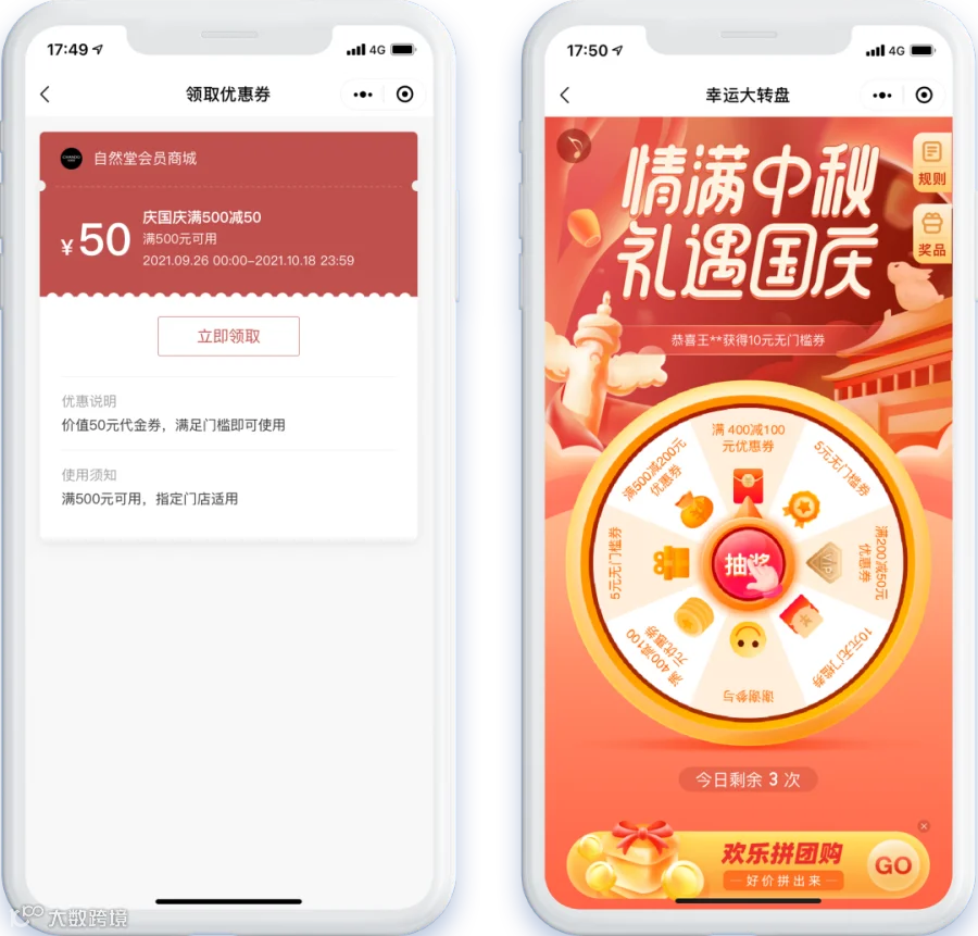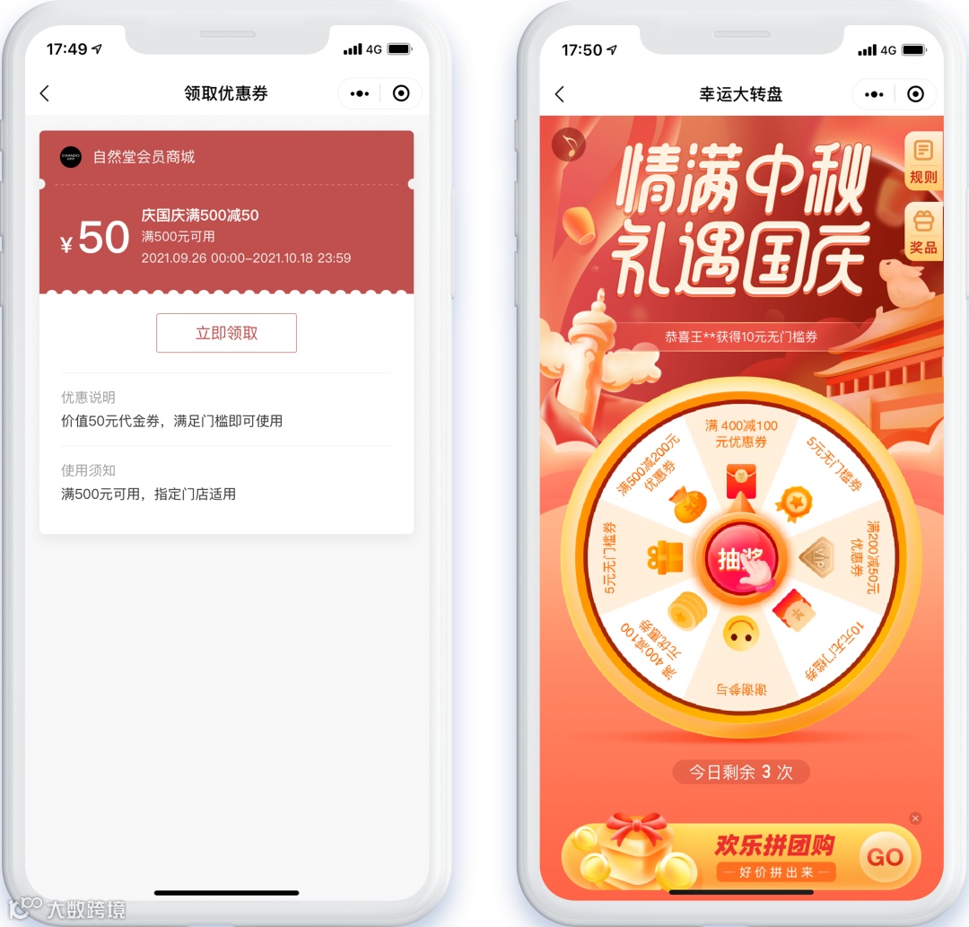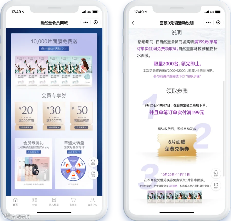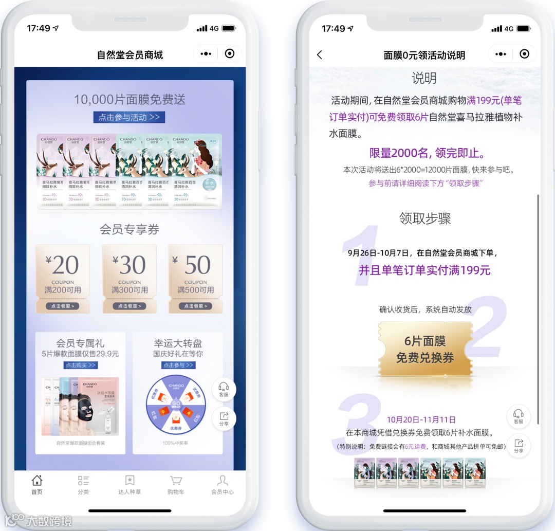 在自然堂会员商城首页,品牌针对不同节日节点设置了丰富的会员营销活动。例如在刚刚过去的国庆出游季,品牌特别推出“10,000片面膜免费送”的限时活动,国庆期间用户在商城下单,单笔订单实付满199元,即可免费领取6片自然堂喜马拉雅植物补水面膜,还可同时享受国庆会员专享满减优惠券和“幸运大转盘”活动,享受折上折福利,激发用户增购、复购的热情。
