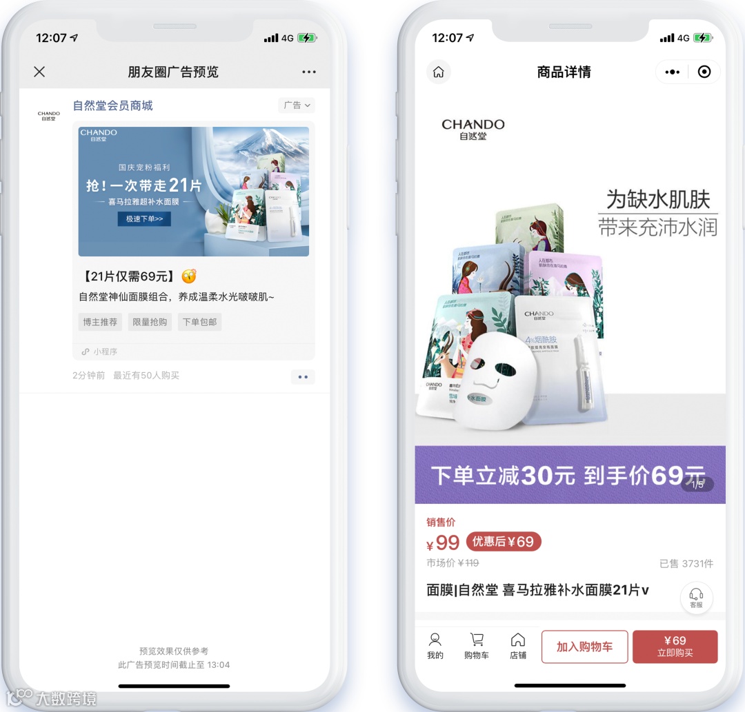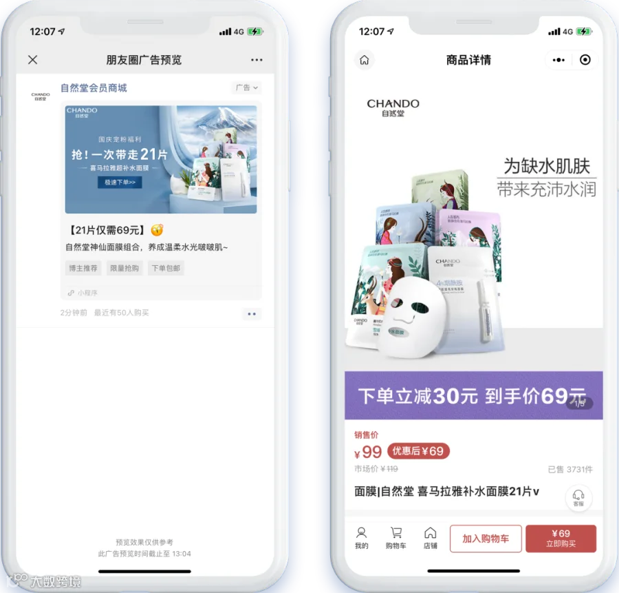 ▲ 「自然堂」朋友圈广告直达小程序商城转化