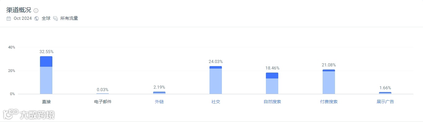 根据similarweb数据显示,Kuvings美国官网的流量主要来自于直接访问流量(32.55%)、社交媒体(24.03%)、付费搜索(21.08%)、自然搜索(18.46%)。