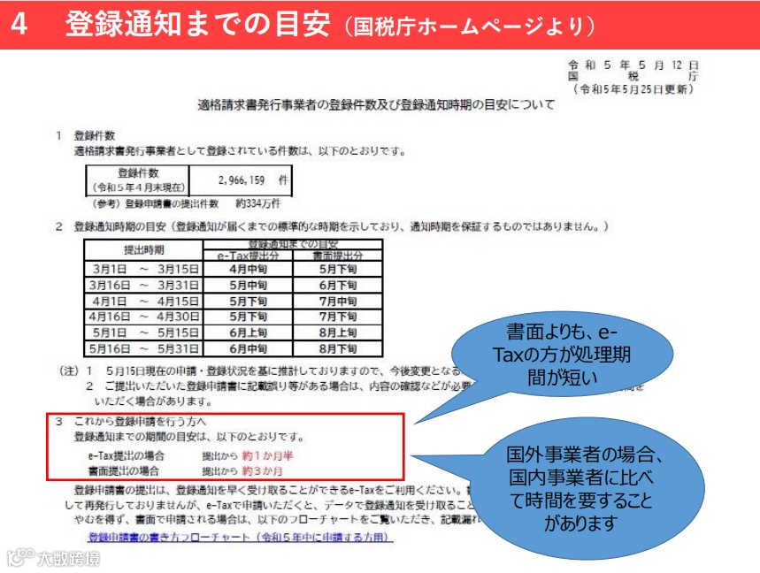 A:首先要确保资料尽量正确完善,和企查查等公开网站上披露的信息一致,这样就可以大大减少税务局工作人员审查核对资料所需的时间,也就能有效缩短下号的时间。其次,目前申请日本JCT的企业数量很多,税务局已经增加人手在处理申请资料。目前,e-Tax申请(也就是我们目前采用的申请方法)会比递交书面材料申请,处理时间更短,e-Tax申请的情况下,平均下号时间是1个半月,书面申请的平均下号时间是3个月。但是国外的申请者肯定要比日本国内的申请者花费更长时间。
