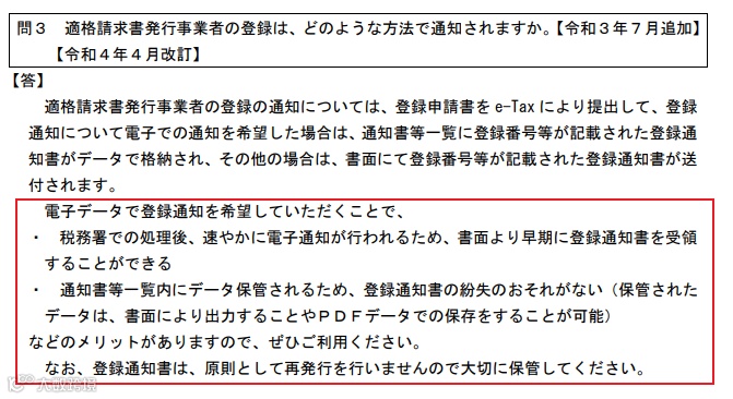 A: JCT注册番号纸质通知书只能寄到纳税管理人的地址。如果由税理士代理注册的话,JCT注册番号通知书就会寄到税理士的地址。但是更推荐使用电子通知书的形式,电子通知书比书面的通知书更快,而且能更好地保存。原则上,纸质通知书只发行一次。