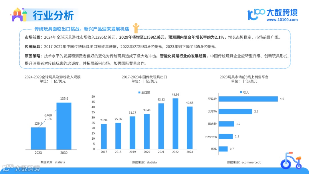 希望大数跨境(10100.com)这份报告可以帮助更多儿童玩具企业成功出海。如需获取完整内容,关注【大数跨境】公众号,回复【2025全球儿童玩具市场洞察报告】即可免费下载。