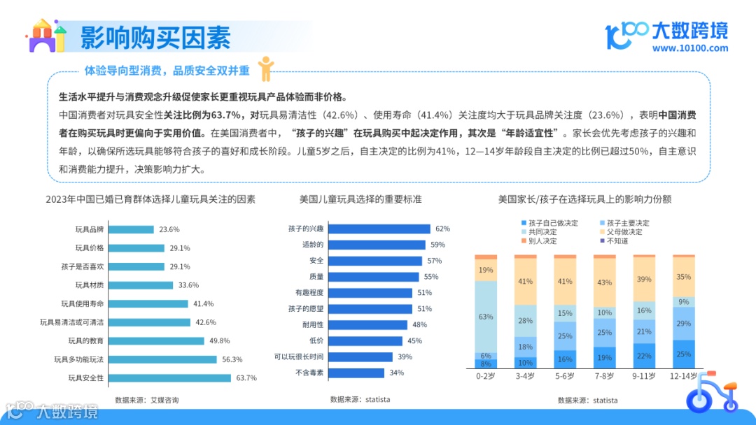 生活水平提升与消费观念升级促使家长注重玩具体验、品质、安全性。中国消费者对玩具安全性关注比例为63.7%,“孩子兴趣”与“年龄适宜性”是美国家长优先考虑的因素。
