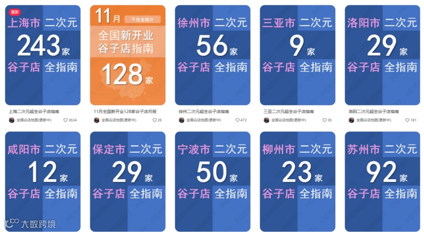 据小红书网友@全国谷店地图(更新中)分享数据显示,国内谷子店数量最多的三个城市分别为上海、北京、成都,对应门店数量分别为243家、221家、195家,11月全国新开谷子店数量128家。