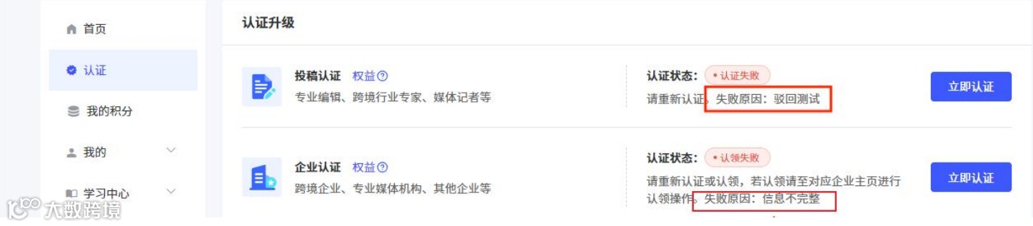 审核驳回都将在【个人中心】-【认证】中显示对应的失败原因,如下图所示。