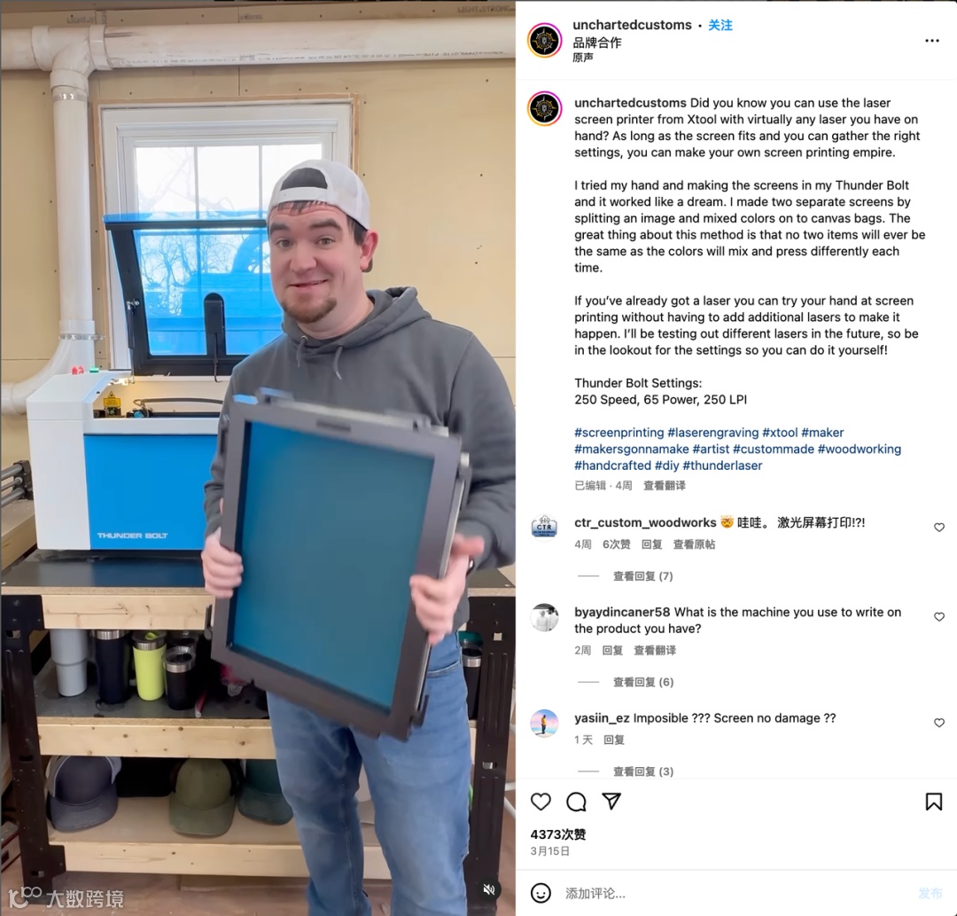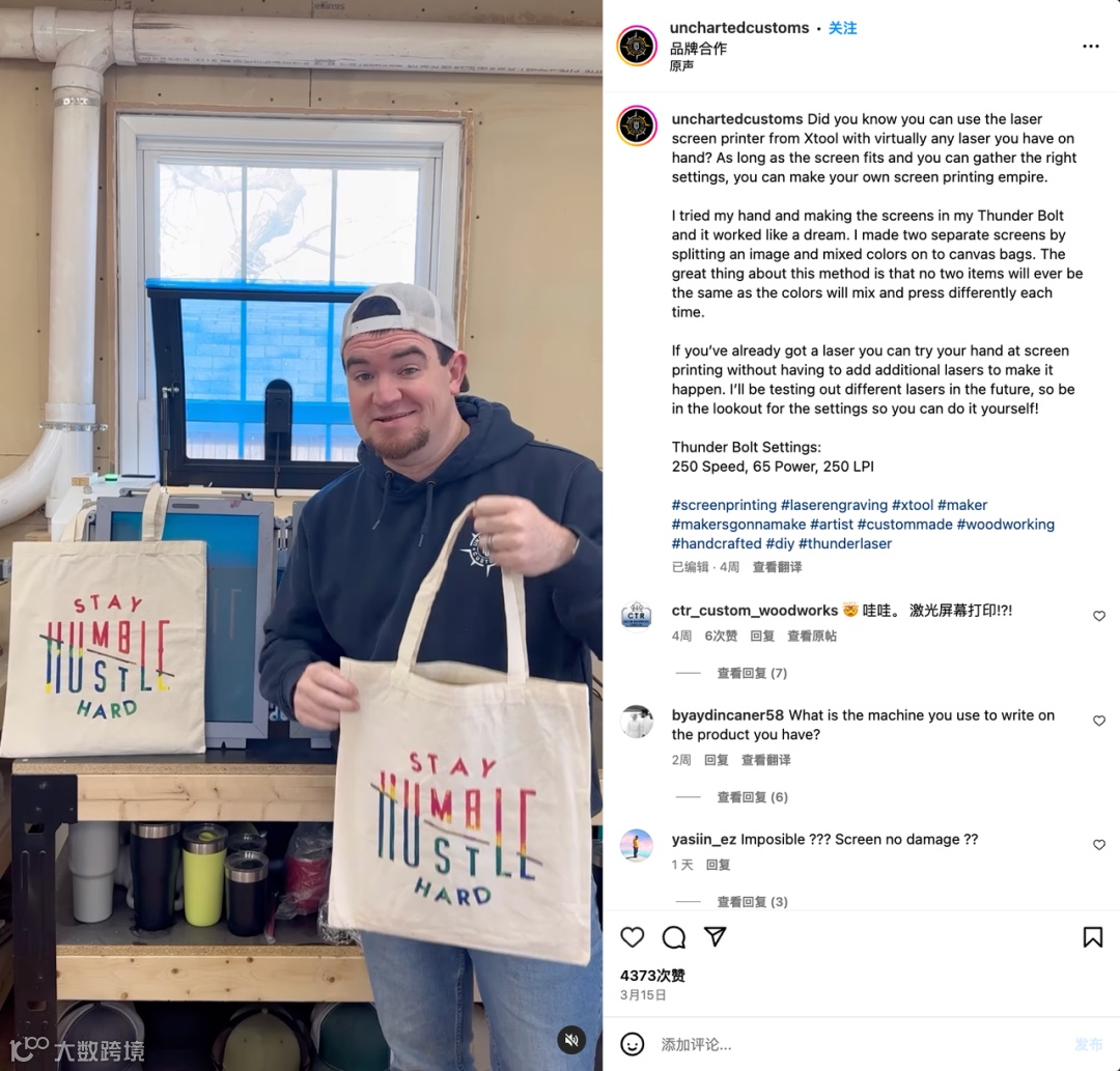 这条内容节奏轻快内容清晰,Sam一直在旁白解说,配合上视频内容,不管是粉丝还是路人都能直观地感受到xTool产品的优点和创意落地的激动。因此,这条合作内容收获了4373次点赞和210条评论,数据反馈相当优秀,互动率也超出行业平均水平!配合上Sam在正文处留下的”煽动性“文案,这条post的转化效果绝对超出预期!