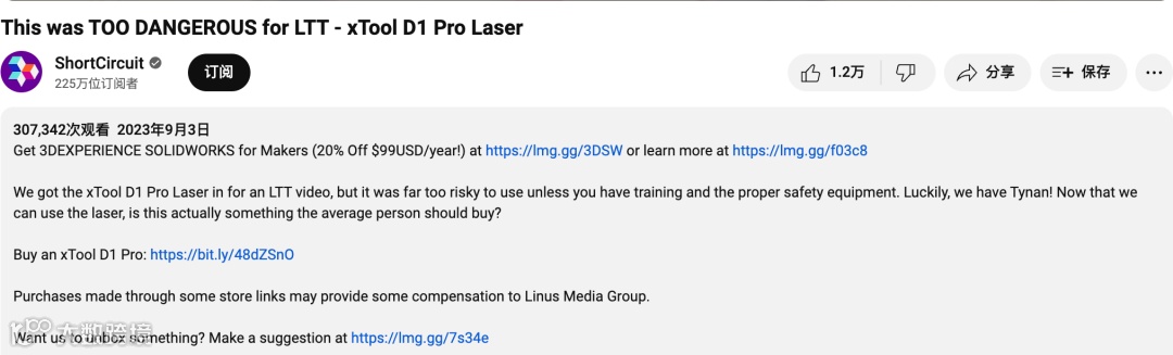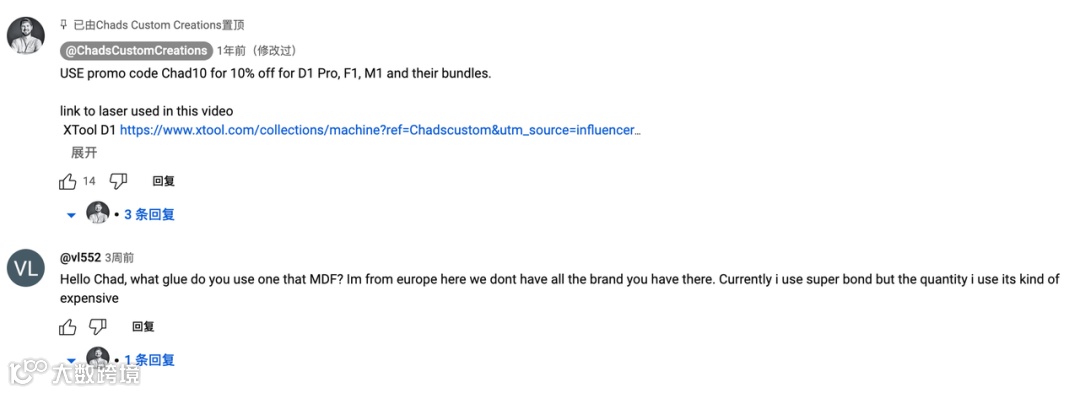 最终,这条充满“商机”的合作视频收获了98万次播放,数据反馈非常优秀。而在视频的简介处和评论区的置顶处,频道主持人也都留下了视频中出现的同款激光雕刻机xTool D1的购买链接,这极大刺激了意向客户的购买意愿和动力。