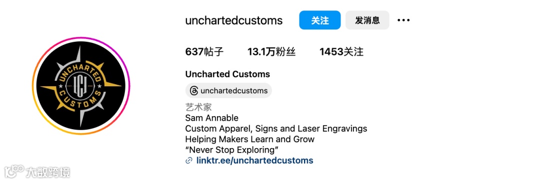 Sam Annable,一位专注定制化需求的手工红人。经常发布自己的工作日常和成果展示,其经营的账号Uncharted Customs拥有13万名粉丝关注,具体画像和xTool的目标客群高度相似,要么是有激光雕刻需求的,要么就是对激光雕刻感兴趣的,合作就此展开。
