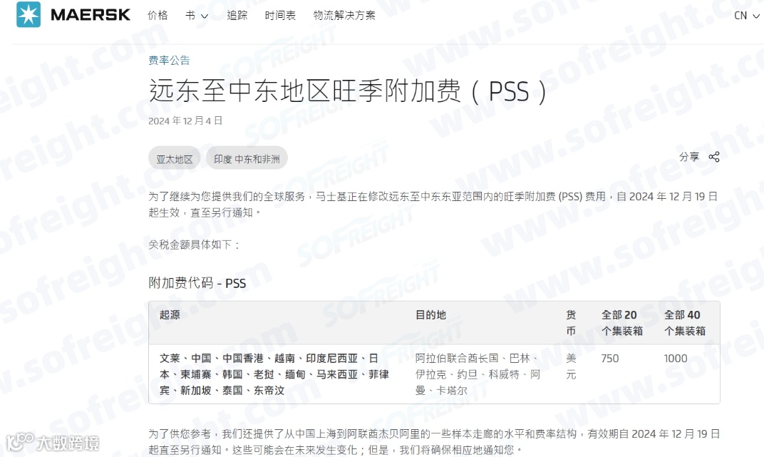 马士基征收远东至中东地区旺季附加费PSS,马士基正在调整征收远东至中东范围内的旺季附加费PSS,自2024年12月19日起生效。