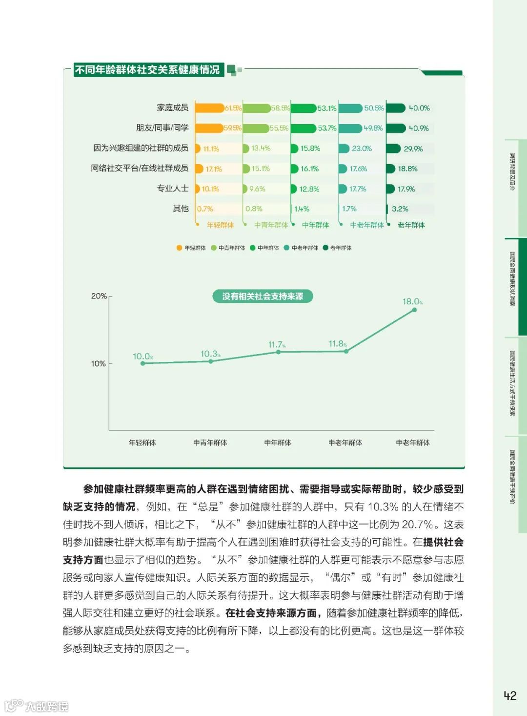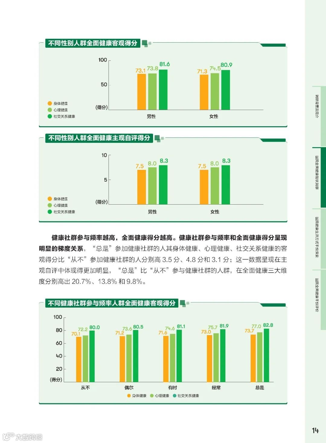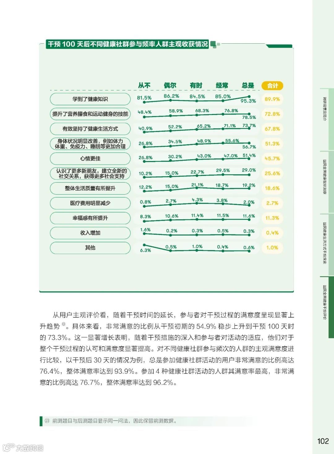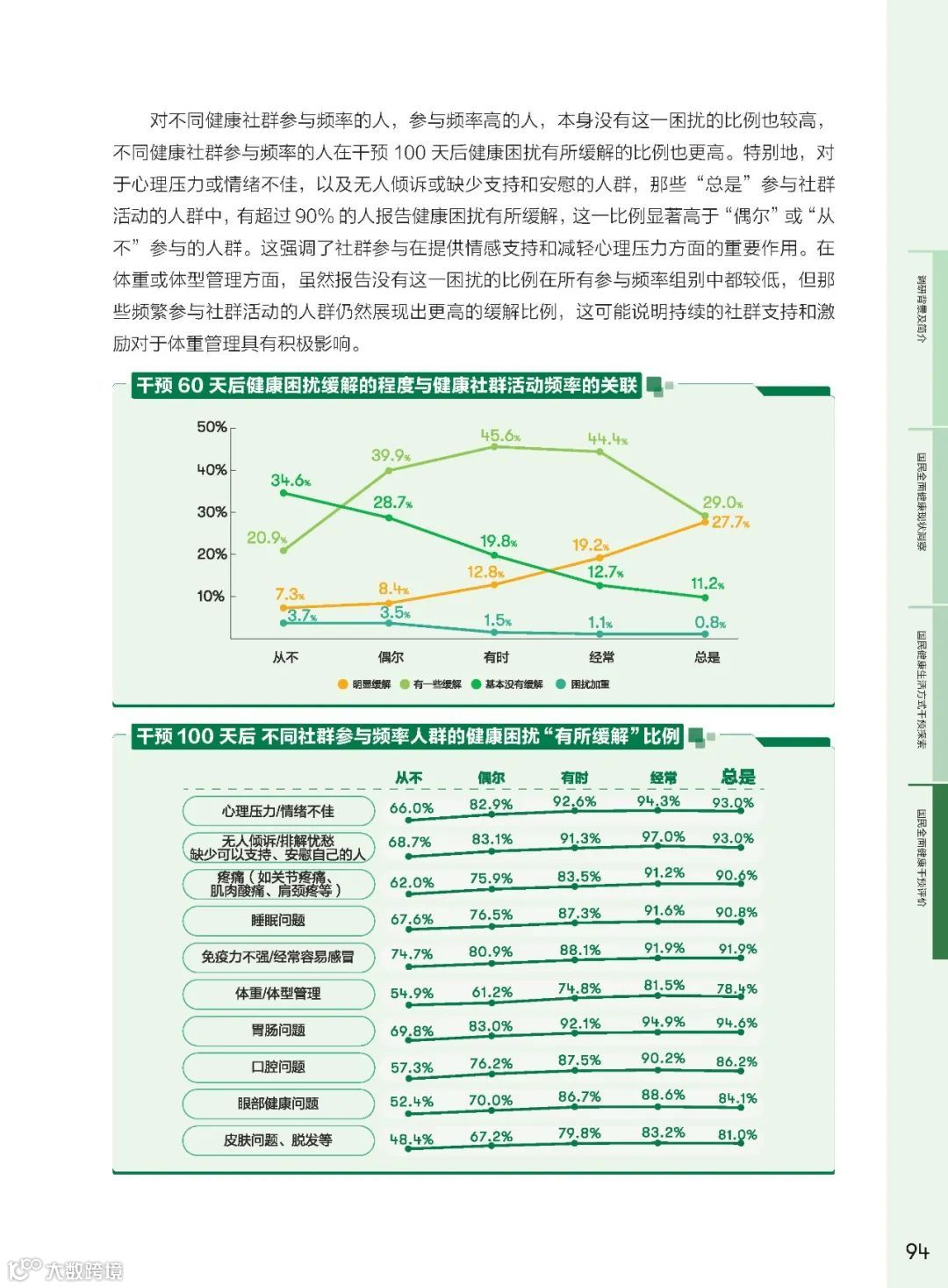 健康社群作为社会支持体系的核心,其在健康干预中的作用越来悦重要。研究发现,参与健康社群的频率与全面健康得分呈正相关。高频参与社群的群体在身体健康、心理健康、社交关系健康方面的得分均有显著提升。