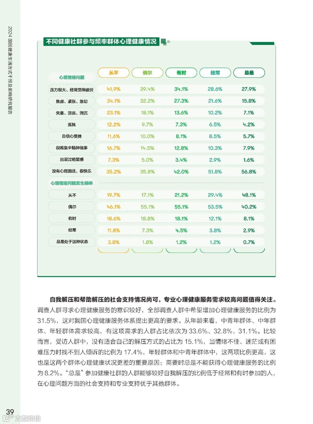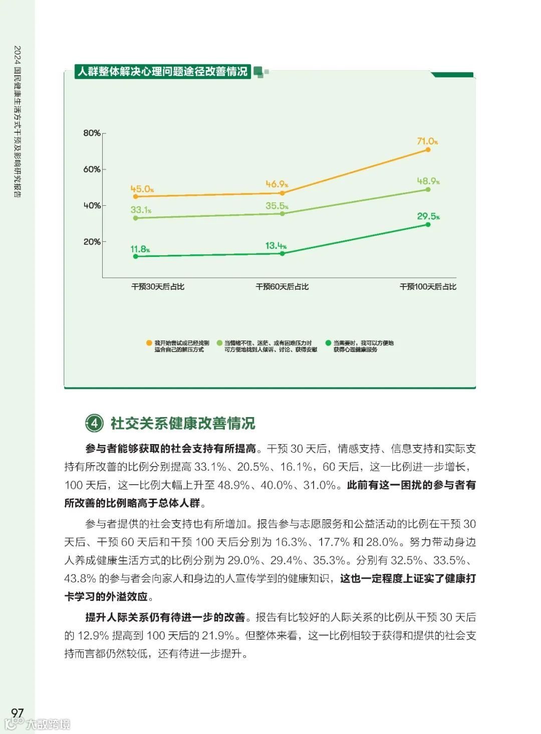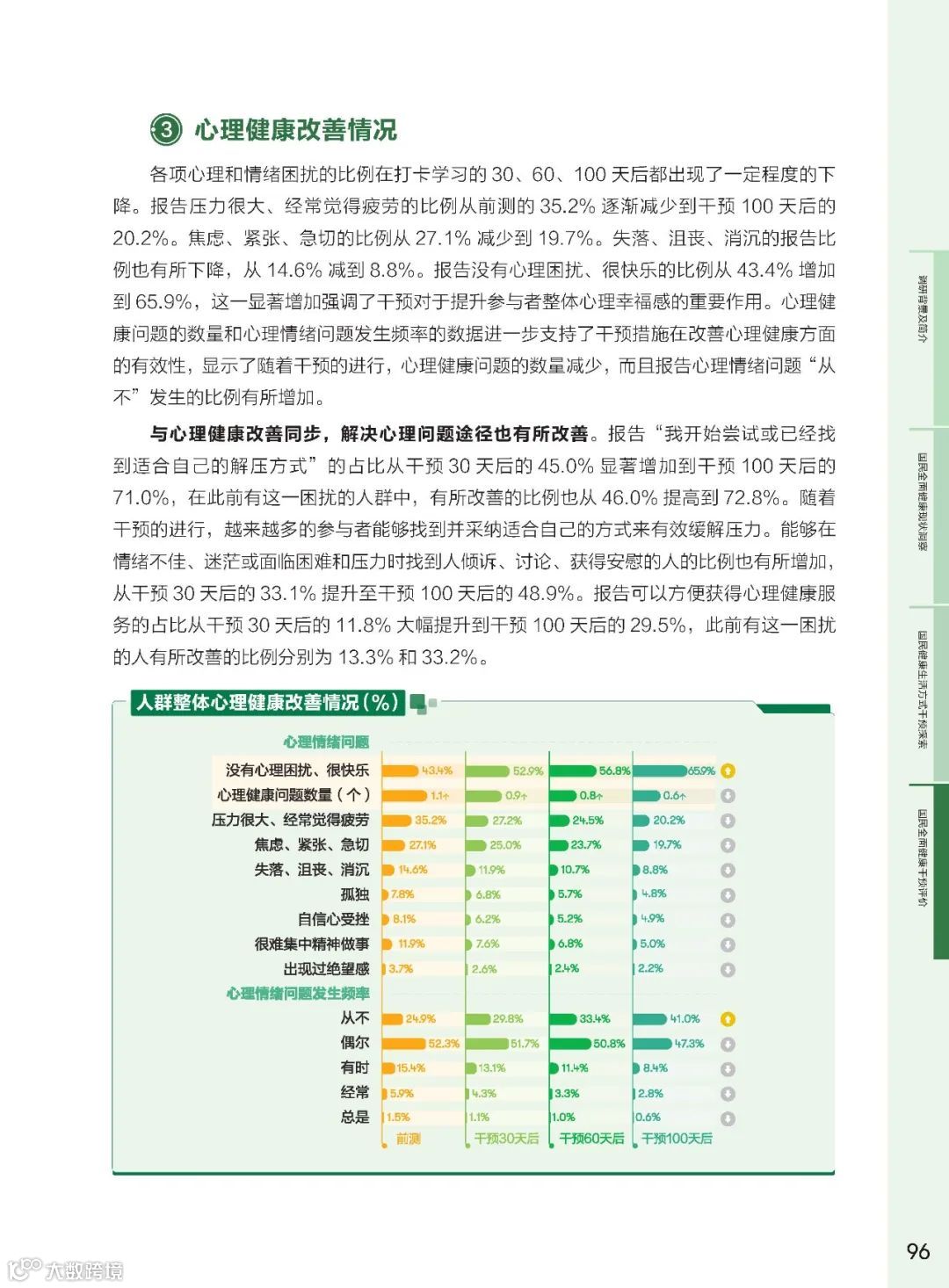 心理健康问题普遍存在,年轻群体问题更加突出。干预后,调研人群积极寻求心理疏导,心理健康问题明显改善。心理健康干预对于提升国民整体健康水平至关重要。