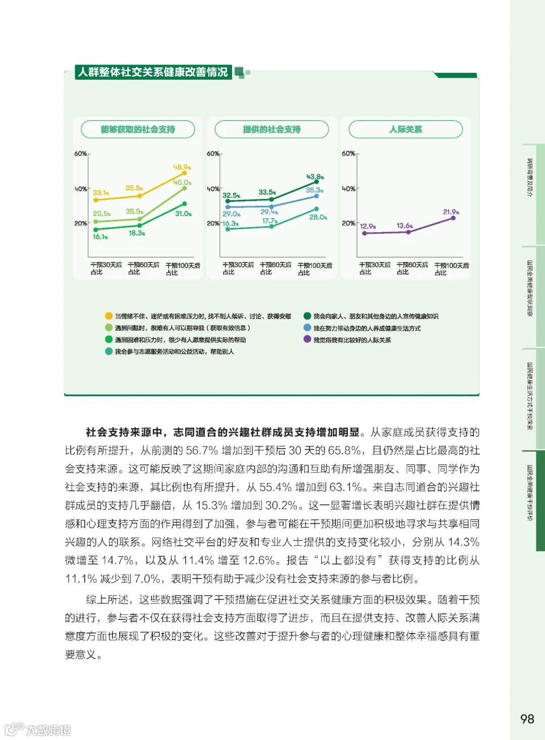 社交关系健康初显现,社交拓展需求高。健康干预后,社会支持来源多元化拓展,健康社群在增强社交关系健康方面的积极作用。