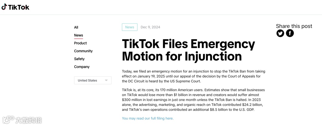 此外,TikTok 最新的动作是,向最高法院提出上诉,暂缓实施这一禁令,以留出更多讨论空间。