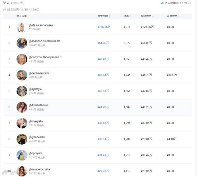 TikTok达人中,排名前十达人大都属于时尚领域,且普遍具有长发或良好的发质。