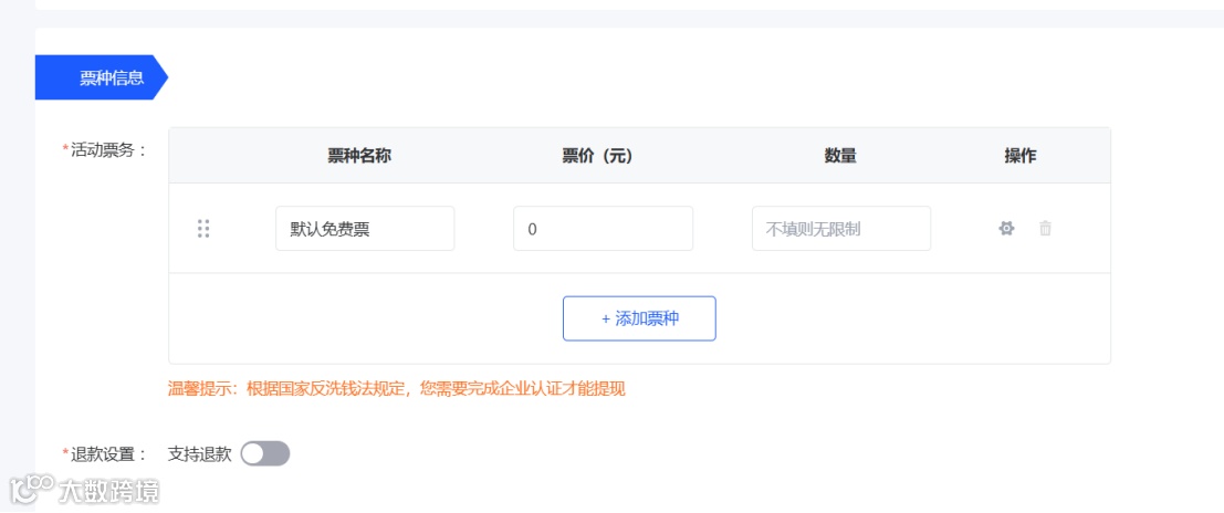 “票种名称”根据具体票种信息进行填写,默认为免费票