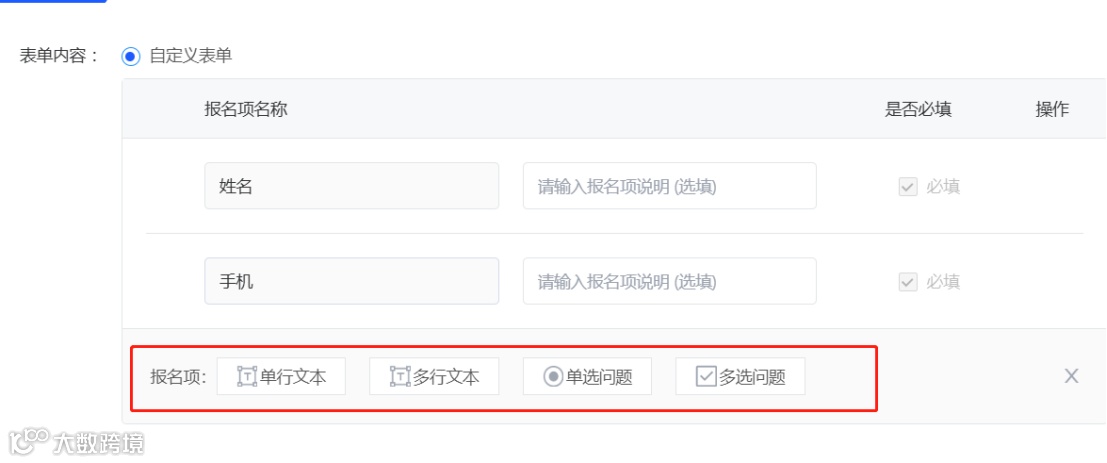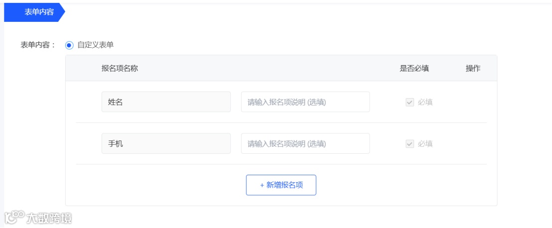 “姓名”“手机”为基础设置项,若有其他报名项需要添加选择“新增报名项”即可