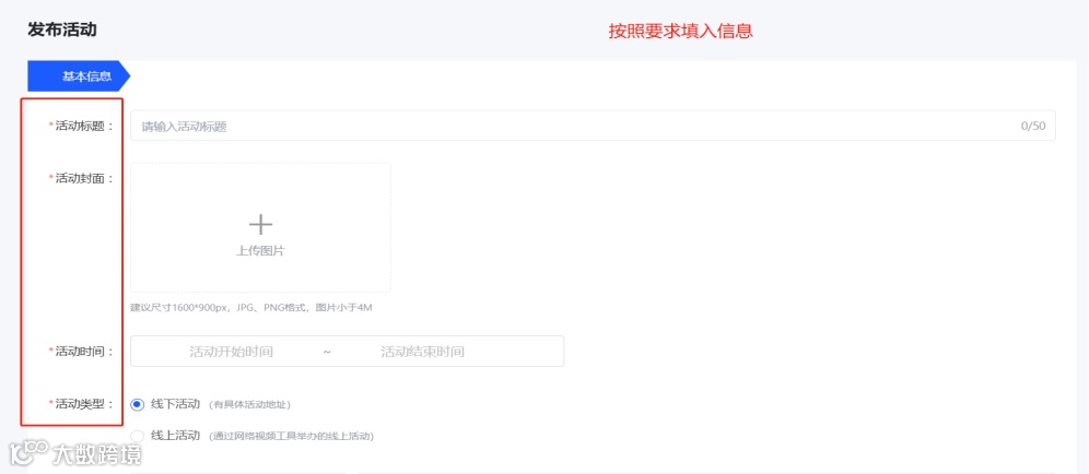 如果是线上活动,需要把“活动类型”更改为“线上活动”(默认为线下),参与方式可以直接填写“线上活动”或者根据活动具体情况填写“视频号直播”、“公众号直播”等