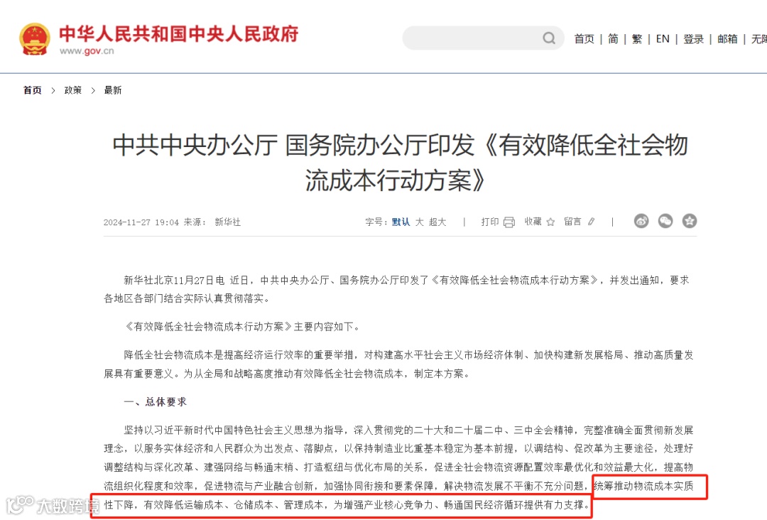 该方案向业内传递了一个明确共识:统筹推动物流成本实质性下降,有效降低运输成本、仓储成本、管理成本。