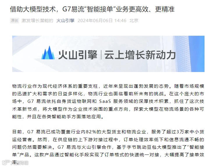 G7易流与火山引擎合作推出了“智能接单”产品,显著提高了接单效率……