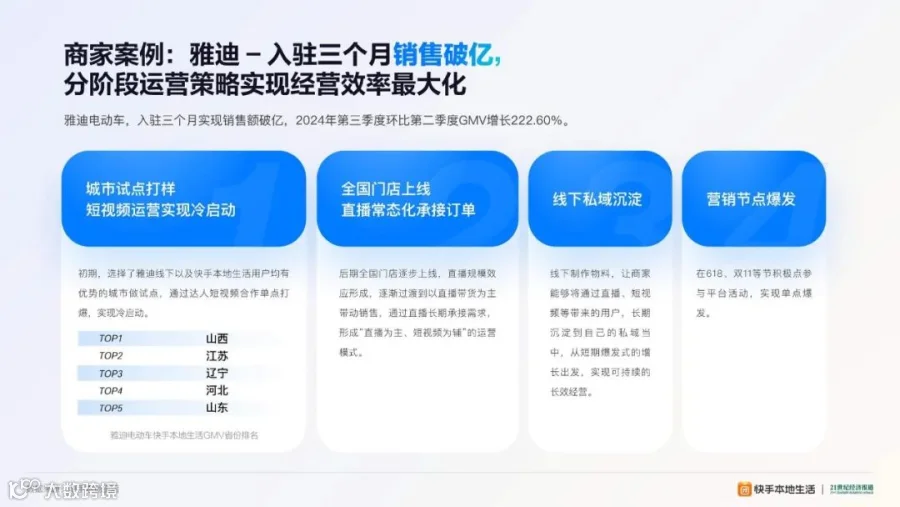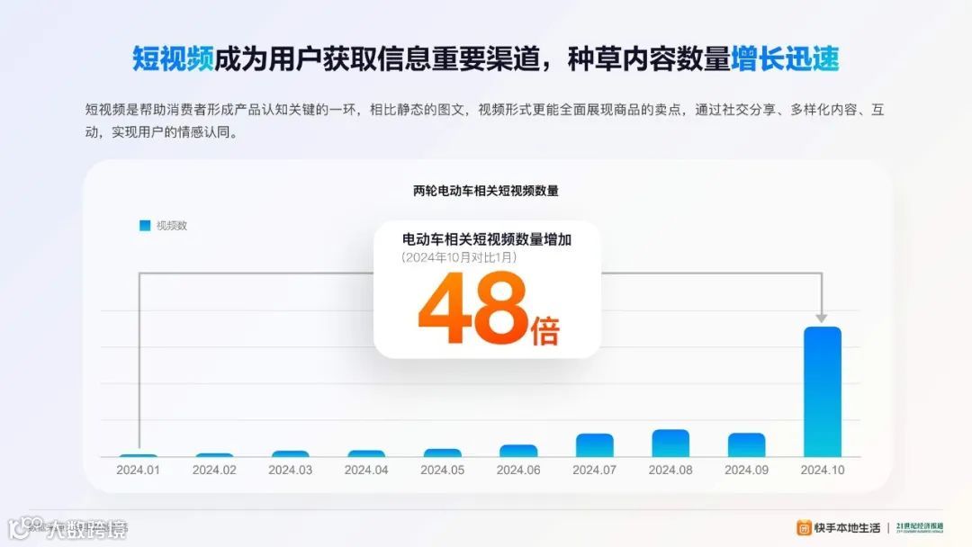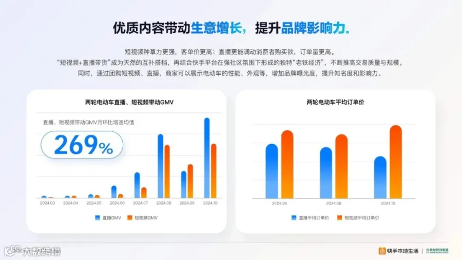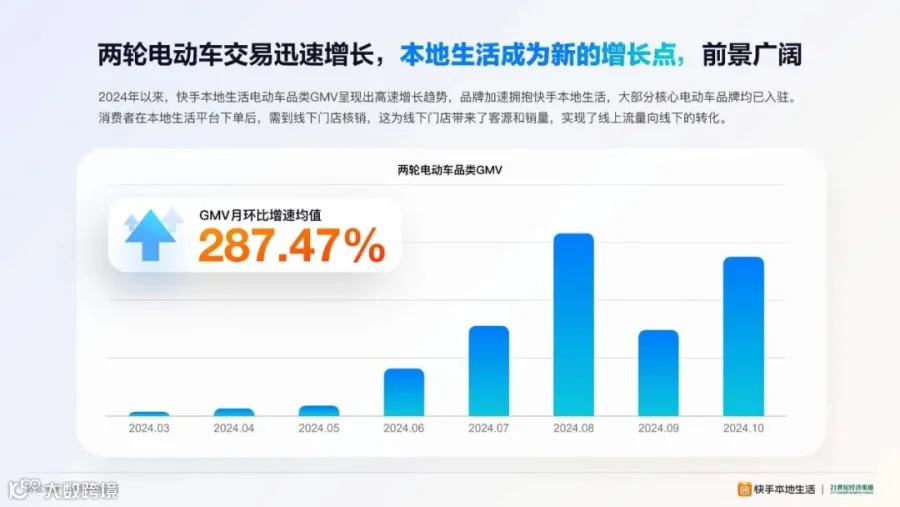 快手本地生活业务的快速发展,为两轮电动车市场的增长提供了助力。2024年1月1日至10月31日,GMV月环比增速均值达287%。这一增长不仅提升了雅迪、九号等头部品牌的线上曝光度,还促进了线下实体店的客流量和销售增加,形成了良性的线上、线下联动效应。