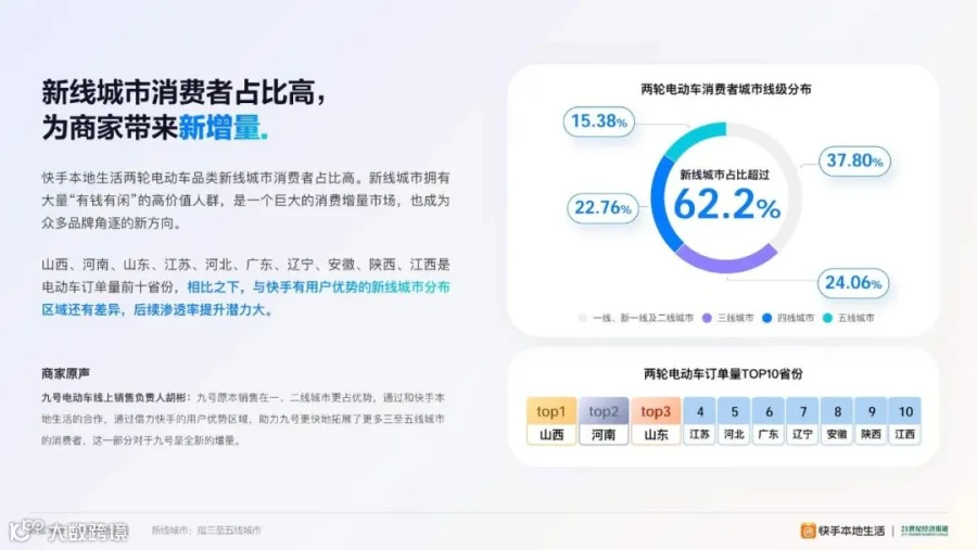 新线城市拥有大量“有钱有闲”的高价值人群,是一个巨大的消费增量市场,也成为众多品牌角逐的新方向。山西、河南、山东、江苏、河北、广东、辽宁、安徽、陕西、江西是电动车订单量前十省份,与快手用户优势的新线城市分布区域还有差异,后续渗透率提升潜力大。