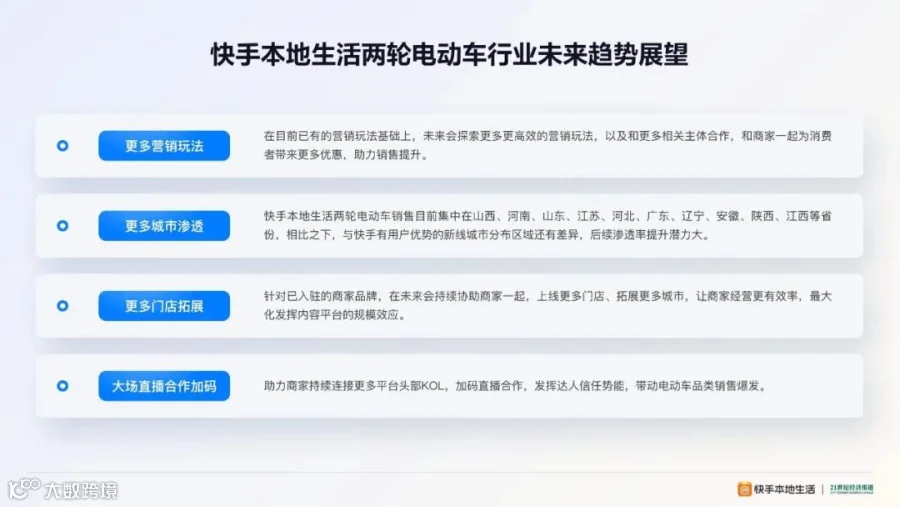 在国内市场增速放缓的背景下,出海寻求突破,借助线上营销带动线下门店销售的新模式,受到越来越多商家的喜爱。本地生活服务成为两轮电动车销量增长的新引擎,精准的用户锚定和高效的内容传播能力,再借助短视频、直播等丰富的内容形式,结合地理位置特性,为品牌开辟了直达消费者的营销路径。