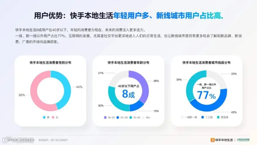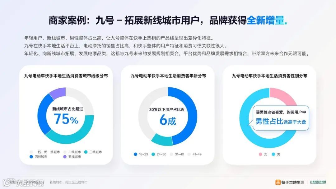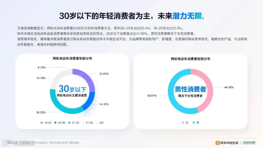 快手的用户群体年轻且新线城市覆盖广,助力品牌拓展年轻用户市场和新线城市市场,进一步扩大市场份额,为行业发展带来新机遇。数据显示,两轮电动车消费者以26至35岁的消费者为主,其中26至35岁占比53.4%,18至25岁占比21.3%。快手本地生活电动车品类消费者整体呈现更加年轻化的特点,30岁以下消费者占比41.38%,男性消费者略多于女性消费者。