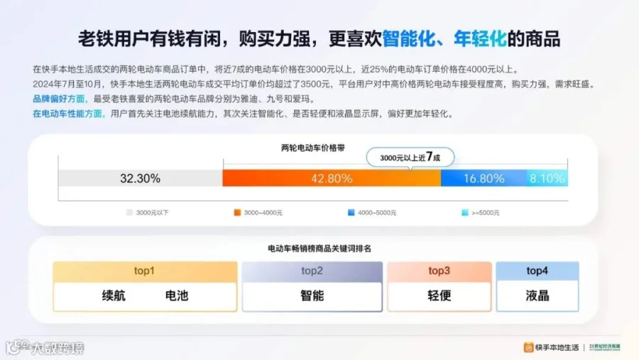 在快手本地生活成交的两轮电动车商品订单中,将近7成的电动车价格在3000元以上,近25%的电动车订单价格在4000元以上。用户首先关注电池续航能力,其次关注智能化、是否轻便和液晶显示屏,偏好更加年轻化。