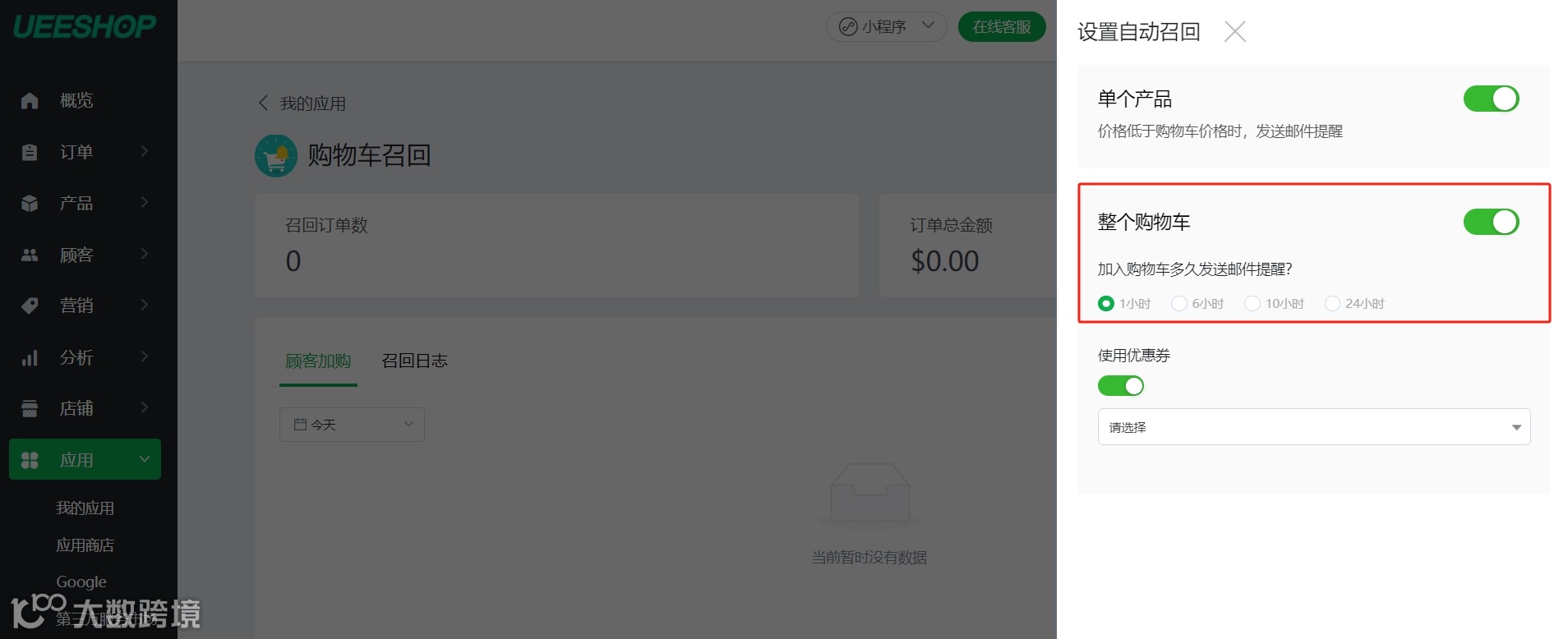 那么如何才能将这部分顾客,拉回到下单流程中呢?购物车召回策略是关键!Ueeshop购物车召回功能,不仅能够帮助挽回流失订单,还能通过巧妙的玩法,提升店铺整体转化率。