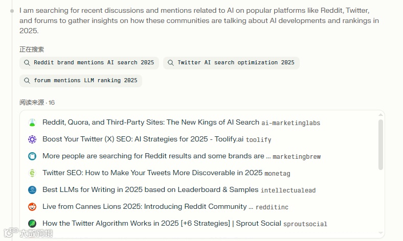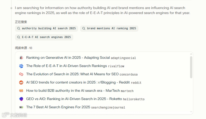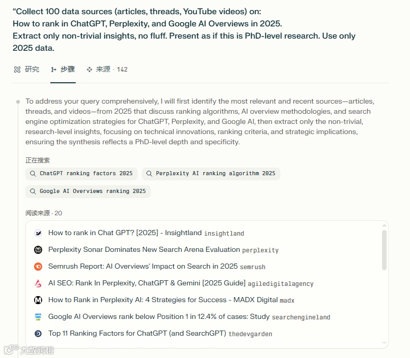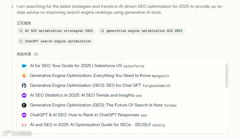 调研后可以发现,Deep Research系统实时检索了所有与GEO优化相关且排名靠前的信息。