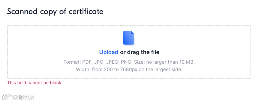 3. 在证书的扫描件区域中,添加照片或文件的扫描本。如果该文件有一页以上,必须上传所有页。扫描本或照片必须高质量而且 清楚,印章和签名必须可见。