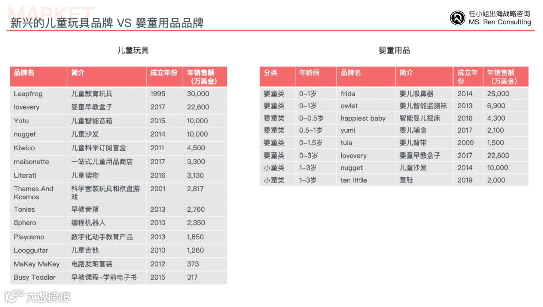 对比这两类产品的市场数据,一个显著特点是:儿童年龄越小,相关消费品市场规模越大,品牌销售额也越高。
