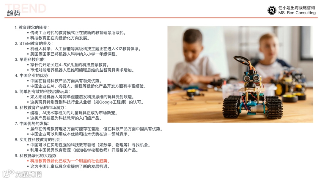 趋势:科技教育低龄化已成为一个明显的社会趋势,这为中国儿童玩具企业提供了新的发展机遇。