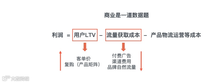 这个公示解释一下就是,企业利润等于用户在其品牌上的终身价值(LTV),即用户在该品牌上的总消费额,减去获取流量、物流及产品运营等成本。我们要做的就是提升用户LTV,降低流量获取成本。这一公式简洁明了,适用于所有企业。