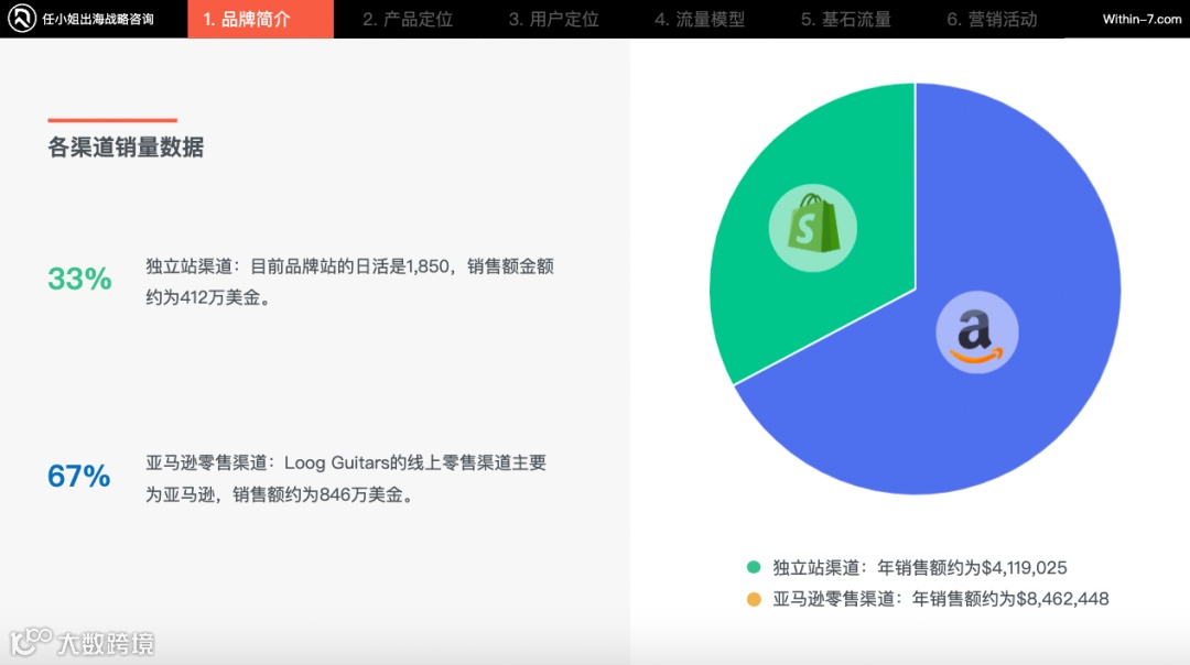 Loog Guitars的线上零售渠道主要为亚马逊,占比67%,销售额约为846万美金;独立站占比33%,目前品牌站的日活是1,850,销售额金额约为412万美金。