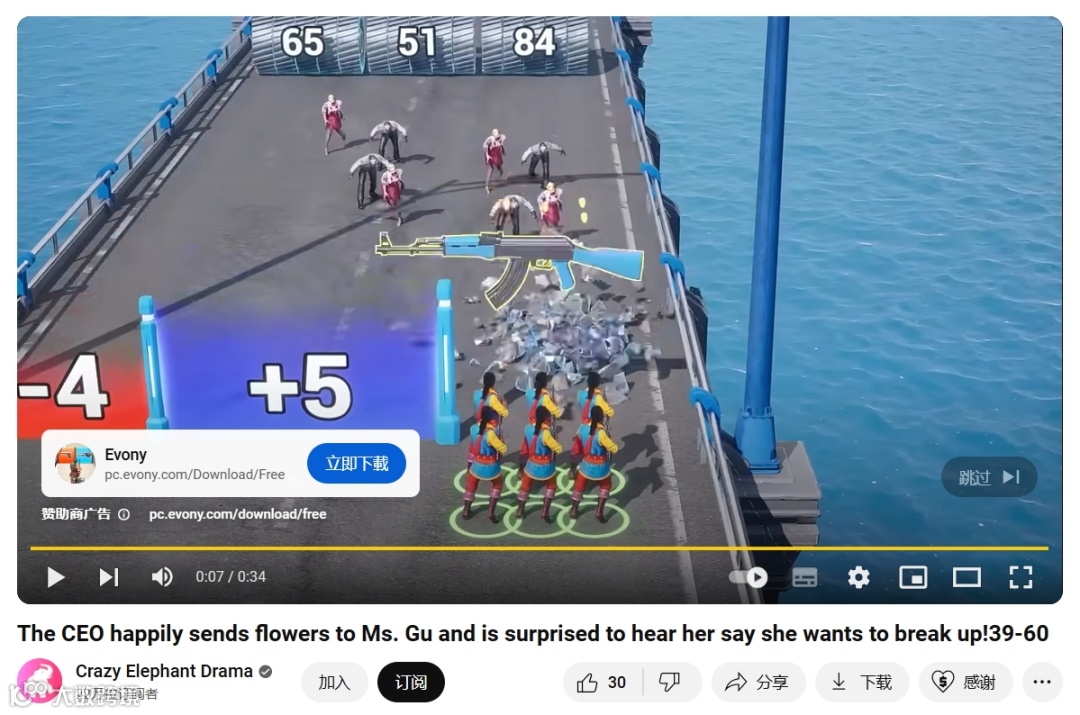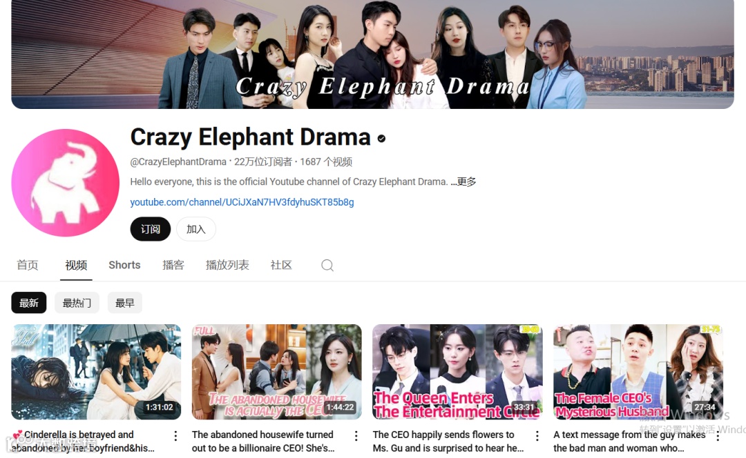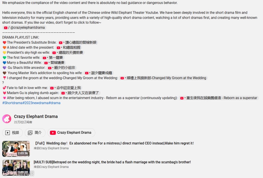 比如YouTube上的短剧分发账号“Crazy Elephant Drama”,频道内容以配上英文字幕的译制剧为主,订阅者数量为22万,累计播放量超过7000万。