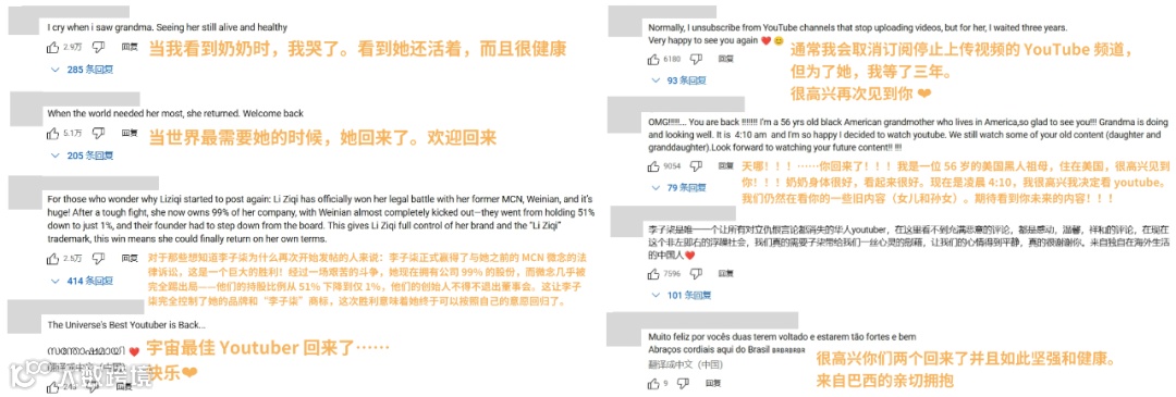 海外社交媒体平台被引爆,上演同样的狂欢,仿佛在一个中文频道里提前看到了世界大同:汉语、英语、葡萄牙语、马拉雅拉姆语(印度官方语言之一)等等各种语言都在表达着同一个欢迎回来的意思,独自在海外生活的中国人、56 岁的美国黑人祖母、远在巴西的老铁等等不分国界、不分肤色的人都几乎要喜极而泣。