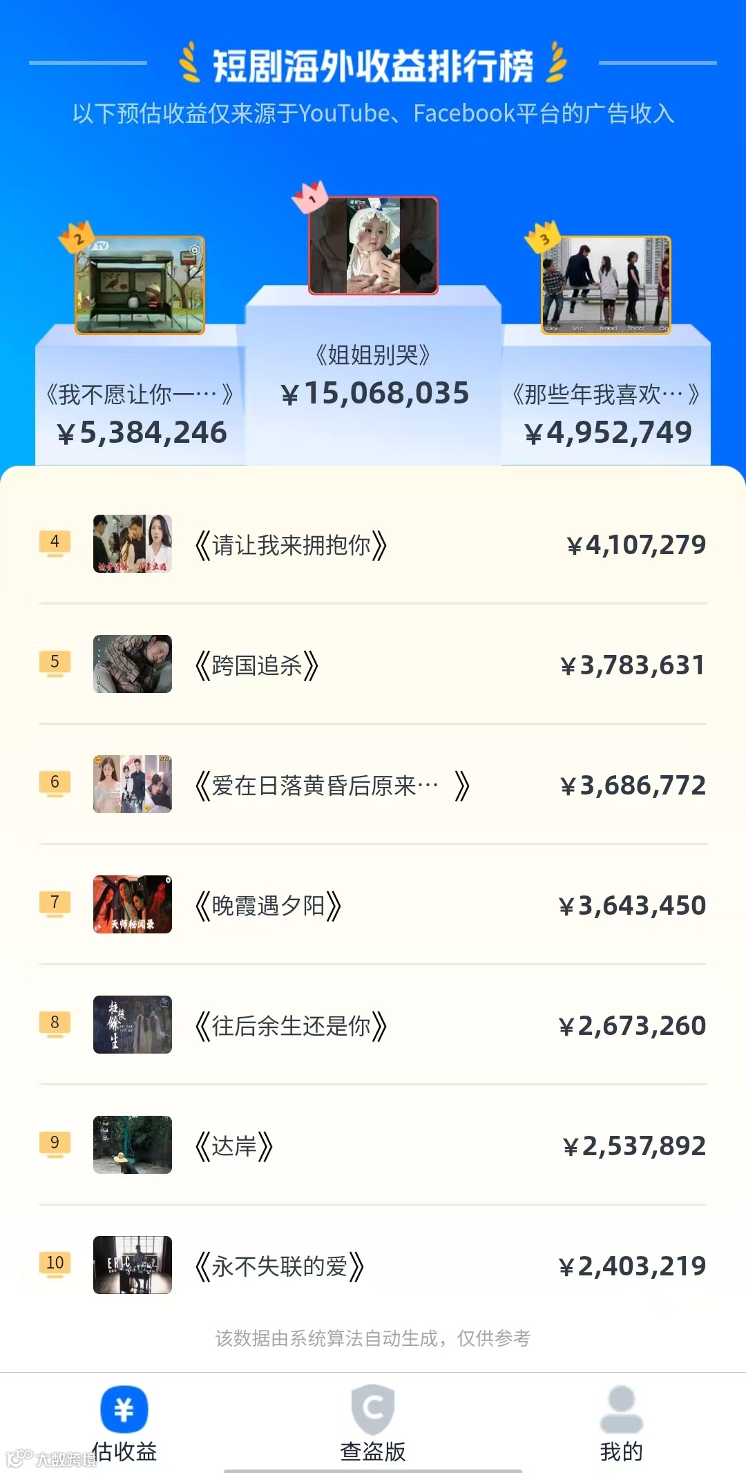 根据“剧权宝”的短剧海外收益排行榜显示,截至发稿前,排名第一的短剧《姐姐别哭》在抖音原生端的播放量为1047.5万,而其海外播放量预估达到5.38亿,来源于YouTube、Facebook平台的广告收入预估接近1507万元。