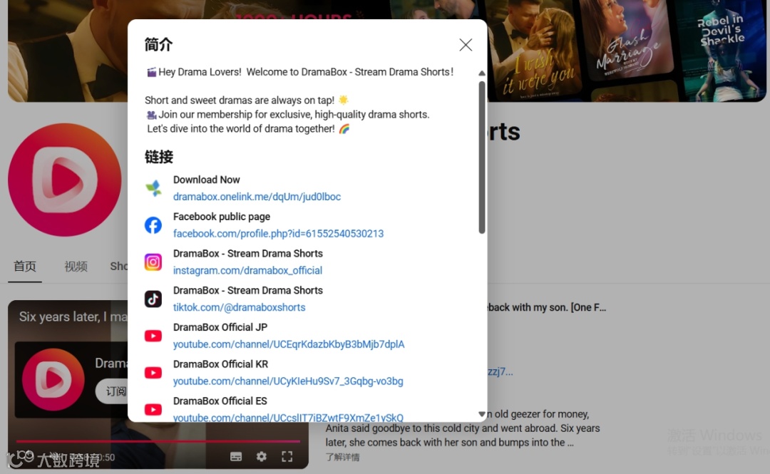 此外,DramaBox的频道简介一口气放了10个链接,包括APP下载链接,Facebook、Instagram、TikTok等其他社媒平台主页链接,细分到日本(JP)、韩国(KR)、西班牙(ES)等区域市场的YouTube主页链接,点击可以看到不同语种的账号界面。