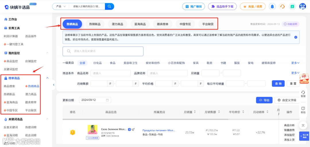 在选爆品方面,可以借助OZON选品工具《快蜗牛选品》(工具地址:kwoniu。com?c=DgI1Wa),使用OZON的商品榜单数据,通过数据去提高选品的准确度。在该榜单中,可以但看OZON平台的热销商品,OZON热销商品、OZON热销新品、OZON潜力商品、OZON蓝海商品、OZON跟卖榜单、OZON中国专区、OZON平台缺货,通过各种OZON榜单选出合适的商品。