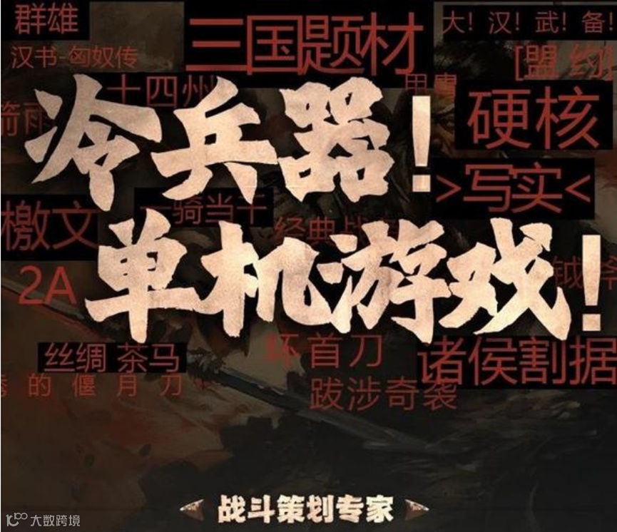 但从灵犀互娱对外发布的招聘启事海报来看,此传言不假,因为海报已经将游戏的关键词都列了出来,诸如“三国题材”,“硬核”,“写实”,“冷兵器”,“单机游戏”等,不过海报中还出现了“2A”的字眼,看来灵犀互娱并没有胆量自称“3A”。而从招聘职位的要求描述文字来看,可以明确这是一款动作类的单机游戏。