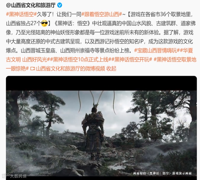 ▲山西省文化和旅游厅为《黑神话:悟空》的热度为山西文旅打Call