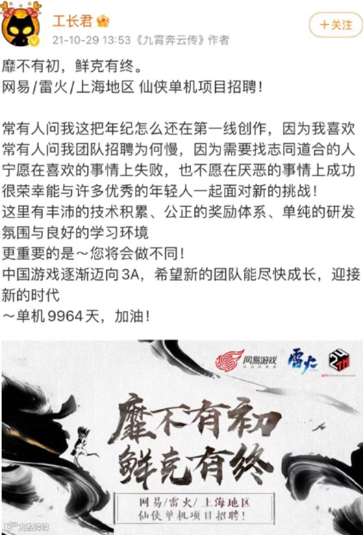 ▲工长君在微博上发布网易雷火旗下临安24th工作室招聘启事