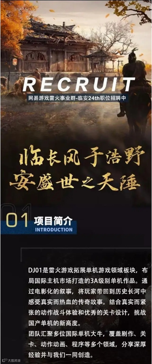 DJ01(DJ为网易内部单机游戏项目的代号简称)是雷火游戏拓展单机游戏领域板块,布局国际主机市场打造的3A级别单机作品,通过电影化的叙事,将玩家带回到历史长河中感受真实而热血的传奇故事。结合真实而紧张的动作战斗体验和优秀的关卡设计,挑战国产单机的新高度。团队汇聚多位国际单机大牛,覆盖剧作、关卡、动作动画、程序等多个领域,分享深厚经验并与我们一同创造。