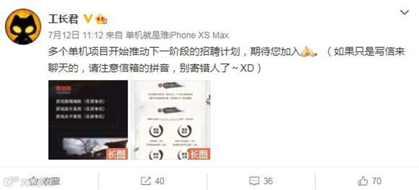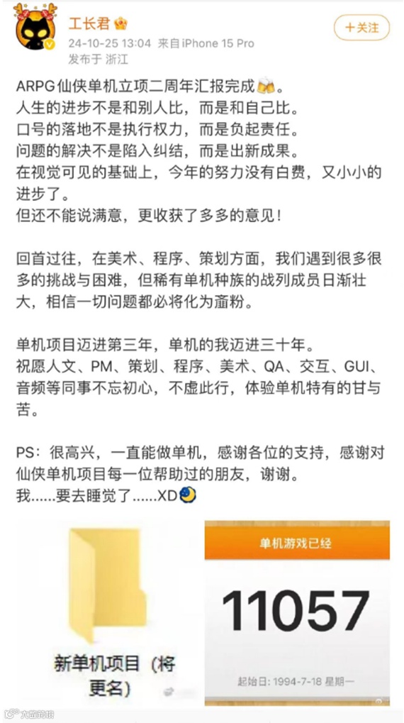 ▲从工长君的最新微博来看,这个新单机项目还没有最终命名