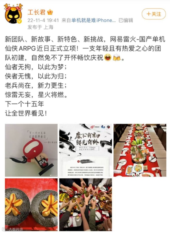 ▲工长君发微博宣布他负责的国产单机仙侠ARPG正式立项