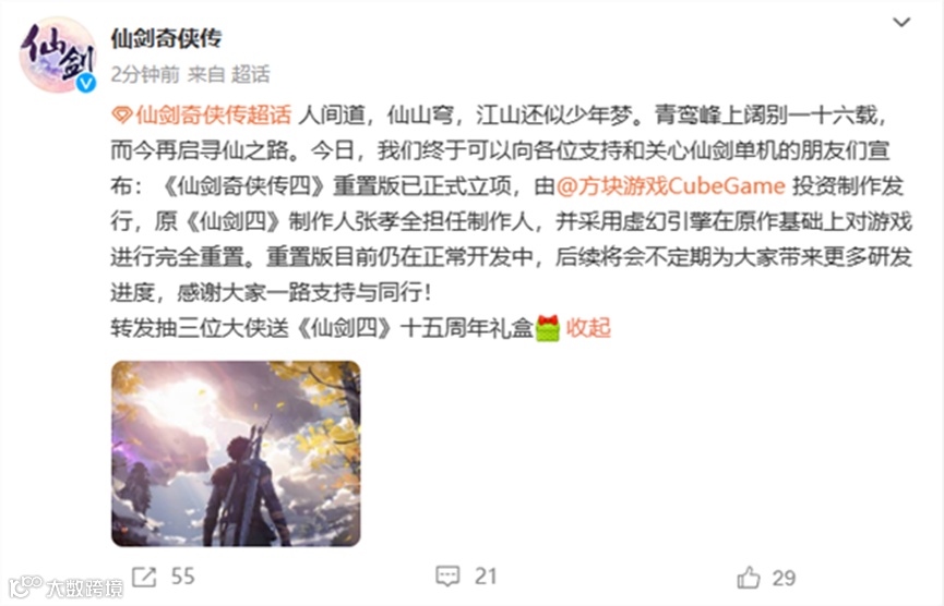 ▲《仙剑奇侠传》官方微博宣布《仙剑奇侠传四》重制版已经正式立项