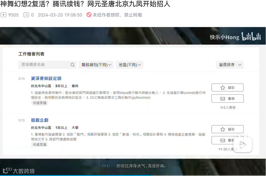 2024年3月15日,位于台北的九凤科技团队突然放出两个职位:资深骨骼设定师与游戏企划,其中游戏企划更优先选择有UE5引擎使用经验者,一时间引发玩家的关注。显然,《神舞幻想·妄之生》终于活过来了,而且游戏引擎还升级到UE5,无疑腾讯将会如支持游戏科学研发《黑神话:悟空》那样,全力支持九凤科技团队研发《神舞幻想·妄之生》。