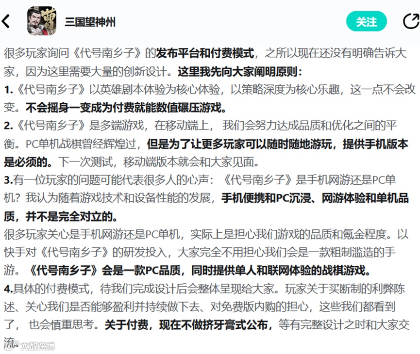 ▲《三国望神州》制作人表哥在TapTap上解答众多玩家的疑问