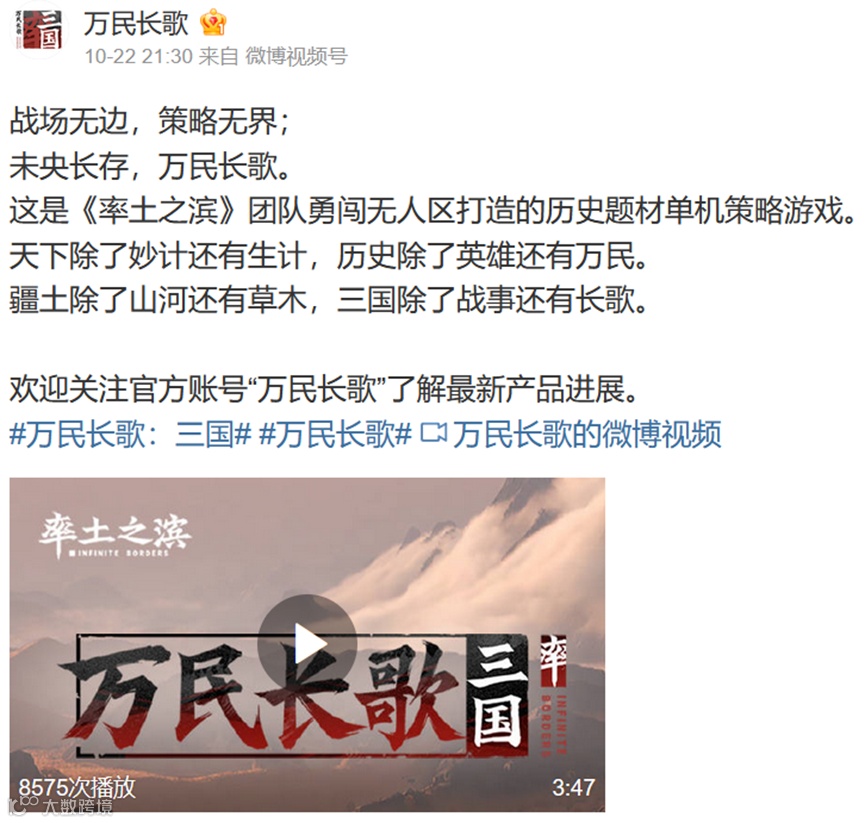 ▲《万民长歌》官方微博表示游戏是由网易《率土之滨》团队打造的历史题材单机策略游戏
